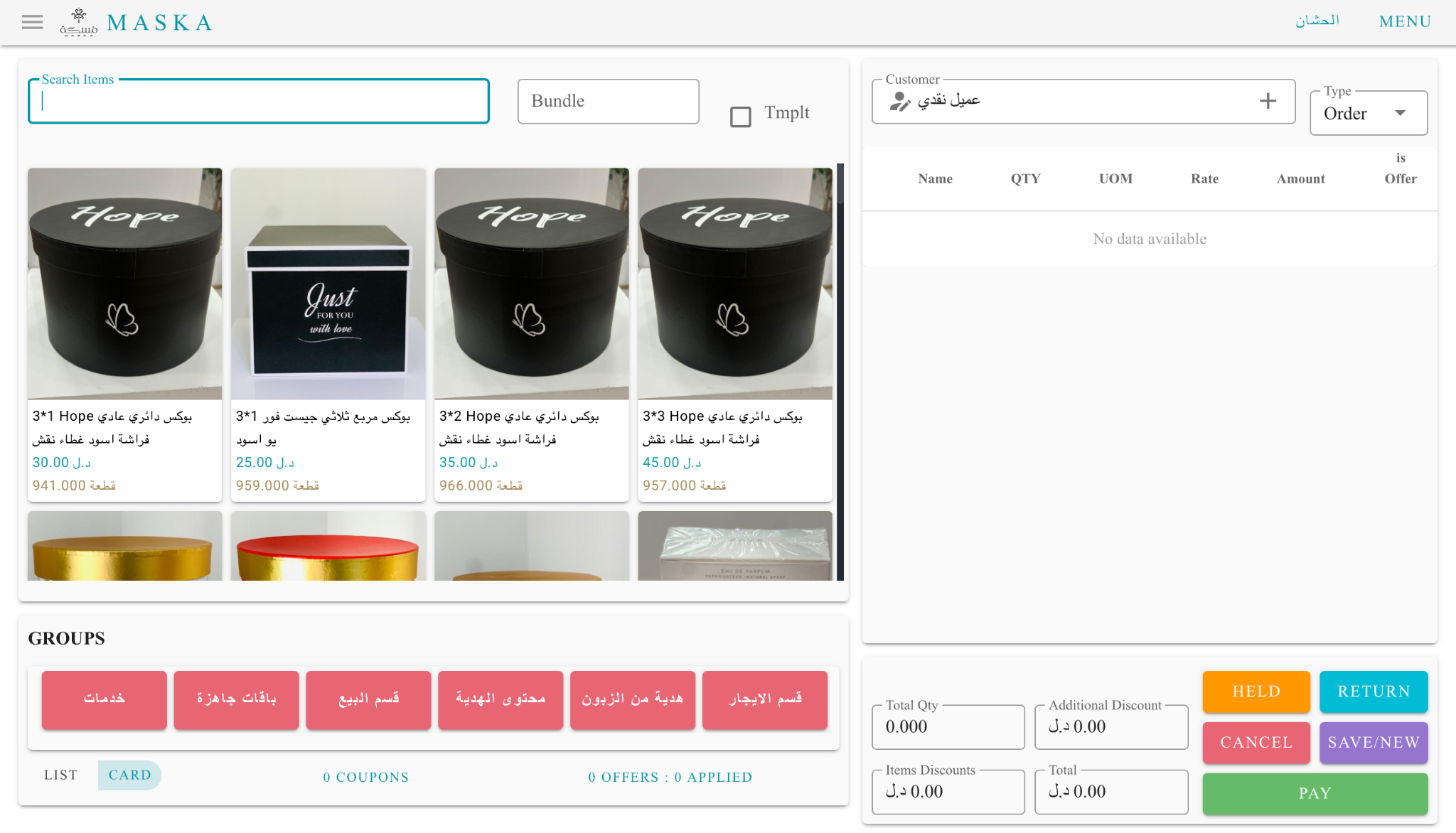 - واجهة نقطة البيع (POS) سهلة الاستخدام تدعم البحث، السلة، ودفع الفواتير.